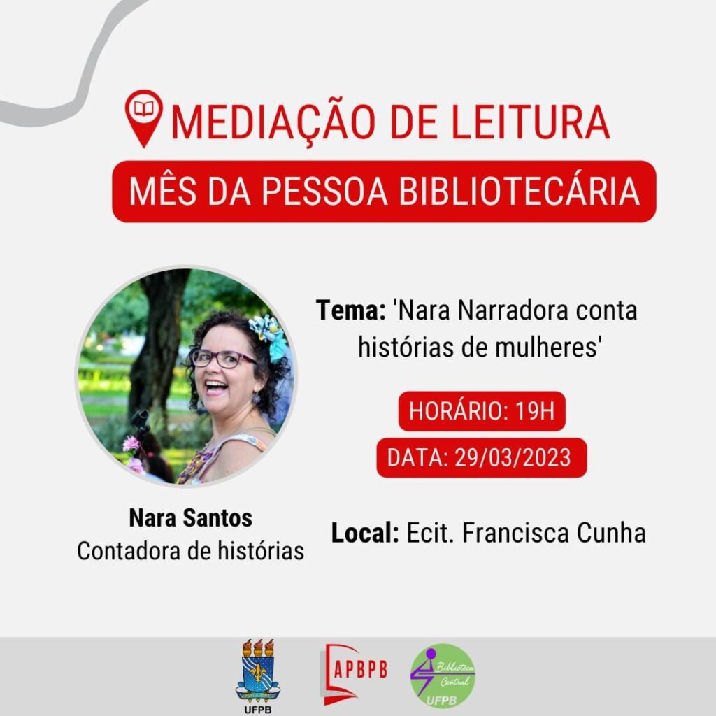 Como parte das ações do Mês da Pessoa Bibliotecária, a Associação Profissional de Bibliotecários da Paraíba (APB-PB), realizará, no dia 29 de março de 2023, às 19h, uma ação de mediação de leitura com uma atividade artística de contação de história. O tema é “Nara Narradora conta histórias de mulheres”, e terá como convidada Nara Santos, contadora de histórias e sócia colaboradora da APB-PB.