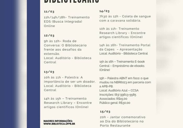14 abr 23 admin III Semana do Bibliotecário Programação para semana dos(as) Bibliotecários(as)? .A @bibliocentralufpb em parceira com a @apbparaiba organizaram uma programação imperdível. 11 a 15…