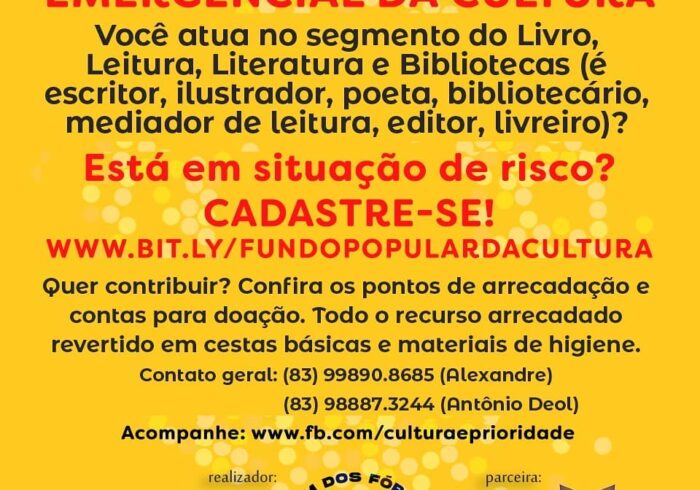 14 abr 23 admin FUNDO POPULAR EMERGENCIAL DA CULTURA Você atua no segmento do Livro, Leitura, Literatura e Bibliotecas (é escritor, ilustrador, poeta, bibliotecário,…