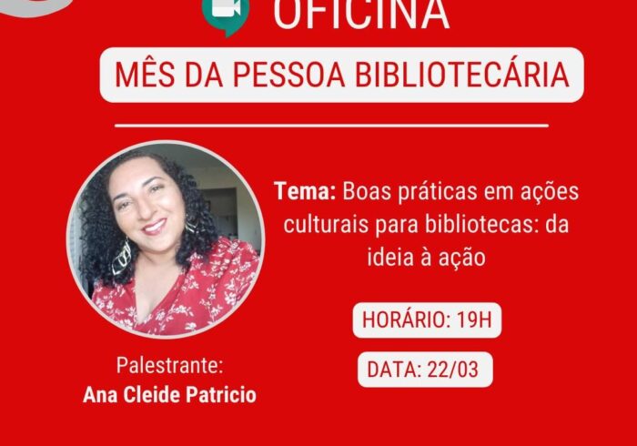 14 abr 23 Eunice Peixoto Oficina | Boas práticas para ações culturais em bibliotecas: da ideia à ação Como parte das ações do Mês da Pessoa Bibliotecária, a Associação Profissional de Bibliotecários da…