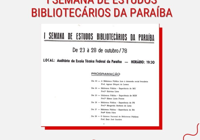 6 dez 22 admin I Semana de Estudos Bibliotecários na Paraíba (28/08/1978 a 02/09/1978) Contou com a presença de Antônio Briquet de Lemos; Eliana Lúcia Pessoa de Araújo; Katia Silva e Emir José Suaidem que proferiu a palestra “Sistema Nacional de Bibliotecas Públicas” publicado pelo INL em 1979.